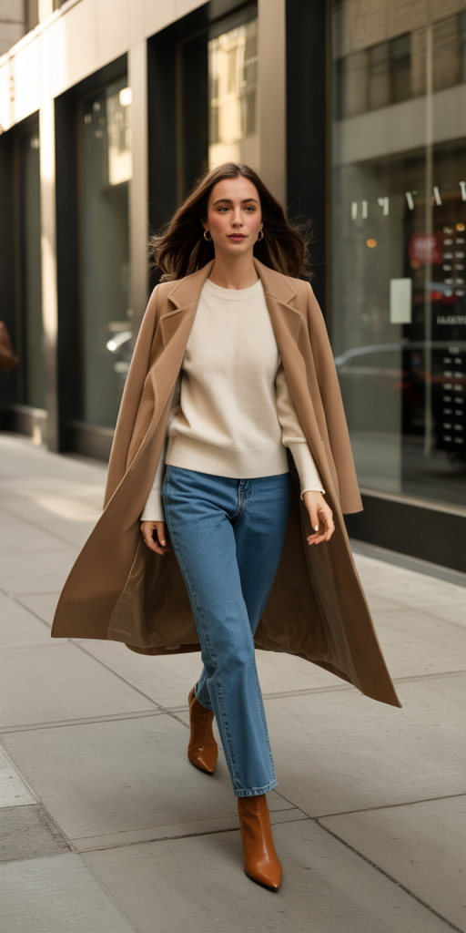 A camel coat offers a timeless base for winter looks. Paired with a white cashmere sweater and blue straight-leg jeans, the outfit feels clean and balanced.