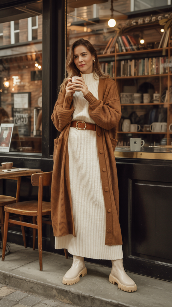Paired with a knitted dress and knee-high boots, the outfit feels comfortable and refined. It works well for cold days when warmth and style are equally important.
